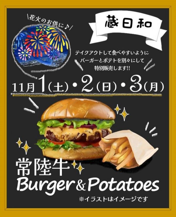 1(土)、2(日)、3(月・祝)は、1日の土浦花火大会のお供に、食べやすくバーガーとポテトを別にした「バーガーポテトセット」で販売いたします!! なんとバーガーは常陸牛バーガー!!