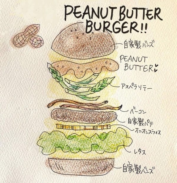 ピーナッツの香ばしい風味とバターのコクが自家製パテやベーコンの旨みとバッチリなバーガーです!!