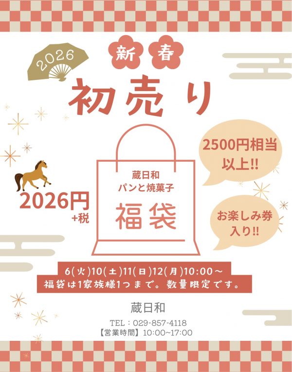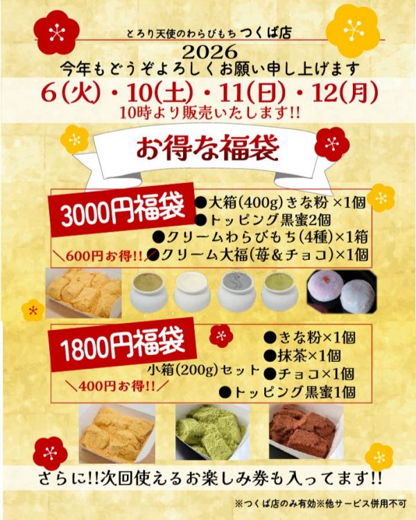 2026年 1月 11日 カテゴリー:blog 蔵日和&わらびもちつくば店:福袋販売します🥰 こんにちは!蔵日和、とろり天使のわらびもち つくば店です! 日頃の感謝を込めまして、今年も福袋を販売いたします😊 蔵日和Instagram とろり天使のわらびもち つくば店 Instagram 数に限りがございますので早めのご来店がおすすめです😊 蔵日和&とろり天使のわらびもち つくば店 藤右ェ門 Instagram 丁字屋KASHIWA-NO-HA Instagram ツイート