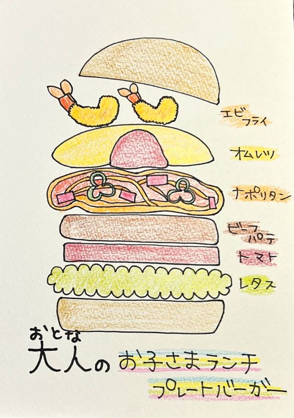 エビフライ、ナポリタンにオムレツ!!お子様プレートの定番メニューを盛り込んだ、大人が楽しめるバーガーです!!